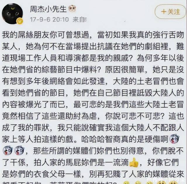 美女在怀应该疼惜才对,为什么非得利用角色之便侵犯人家呢?竟然还有脸混迹娱乐圈,那之后又得祸害多少优秀的女演员啊! 周杰对于林心如的吐槽并没有反击,时隔多年,才在自己的社交媒体回复:你说可不可悲?竟然因为我是大陆人就不配跟人家的上等人拍戏吗?